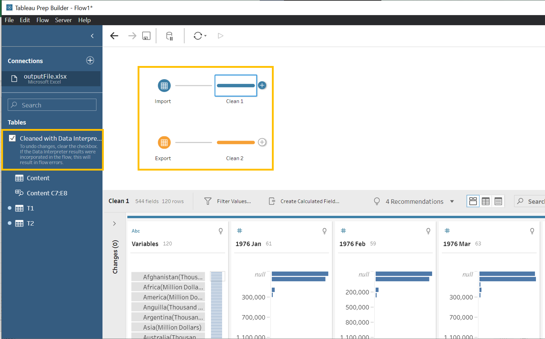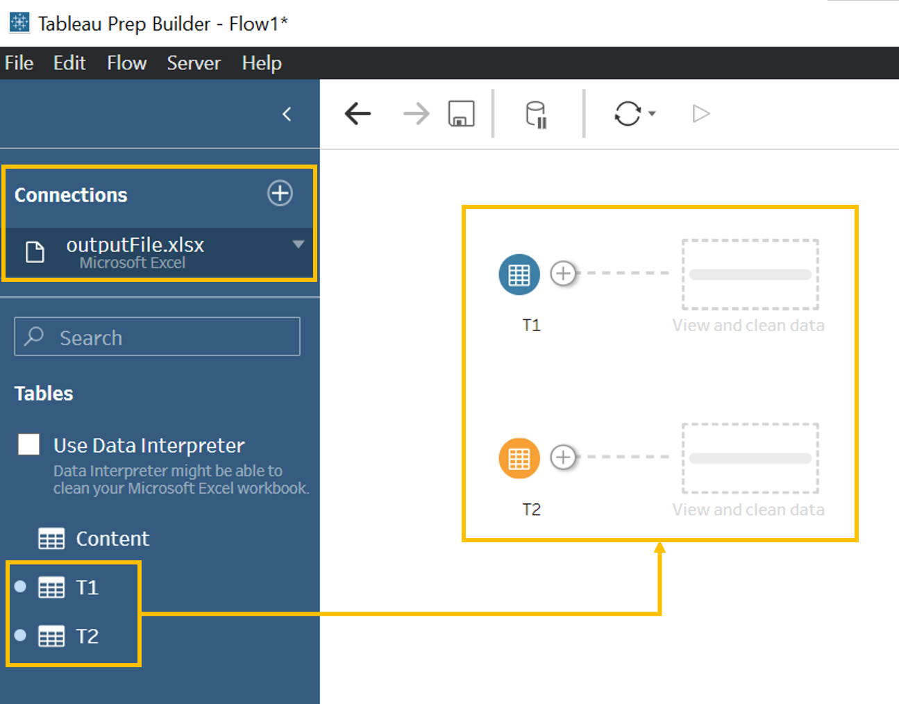 | 2 | Use the Data Interpreter. Rename ‘T1’ and ‘T2’ to ‘Import’ and ‘Export’ respectively and initiate the cleaning node from each data node. | ![]() |