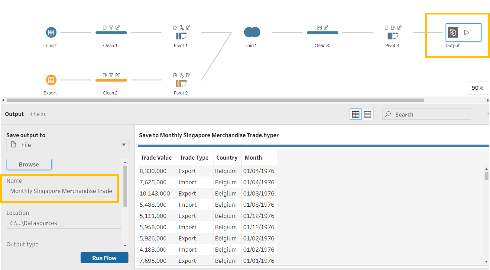 | 11 | Create a ‘Output’ node after ‘Pivot 3’ node and save output as ‘Monthly Singapore Merchandise Trade’. | ![]() |