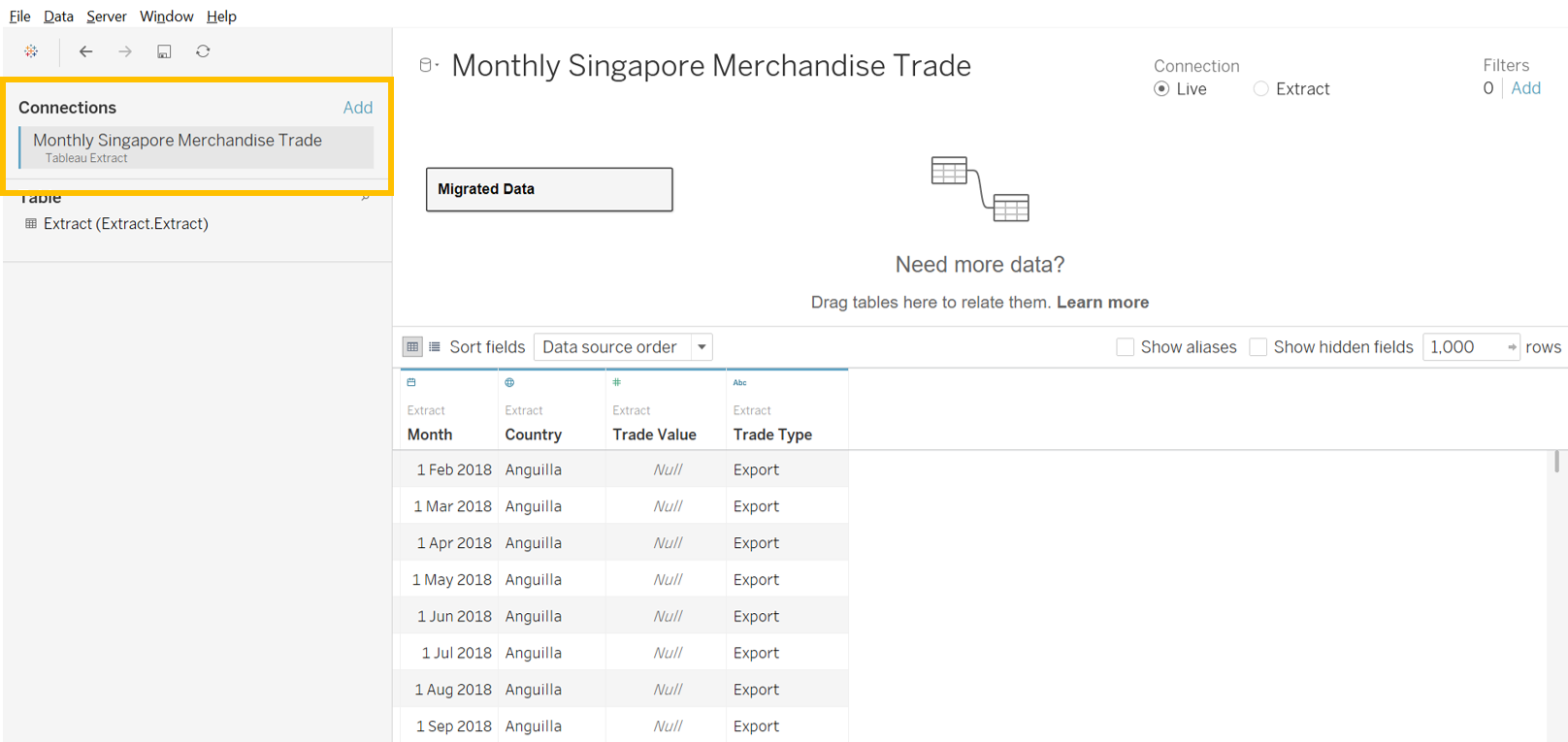 | 12 | Set up a connection on Tableau Desktop to the ‘Monthly Singapore Merchandise Trade’ hyper’s extract. | ![]() |