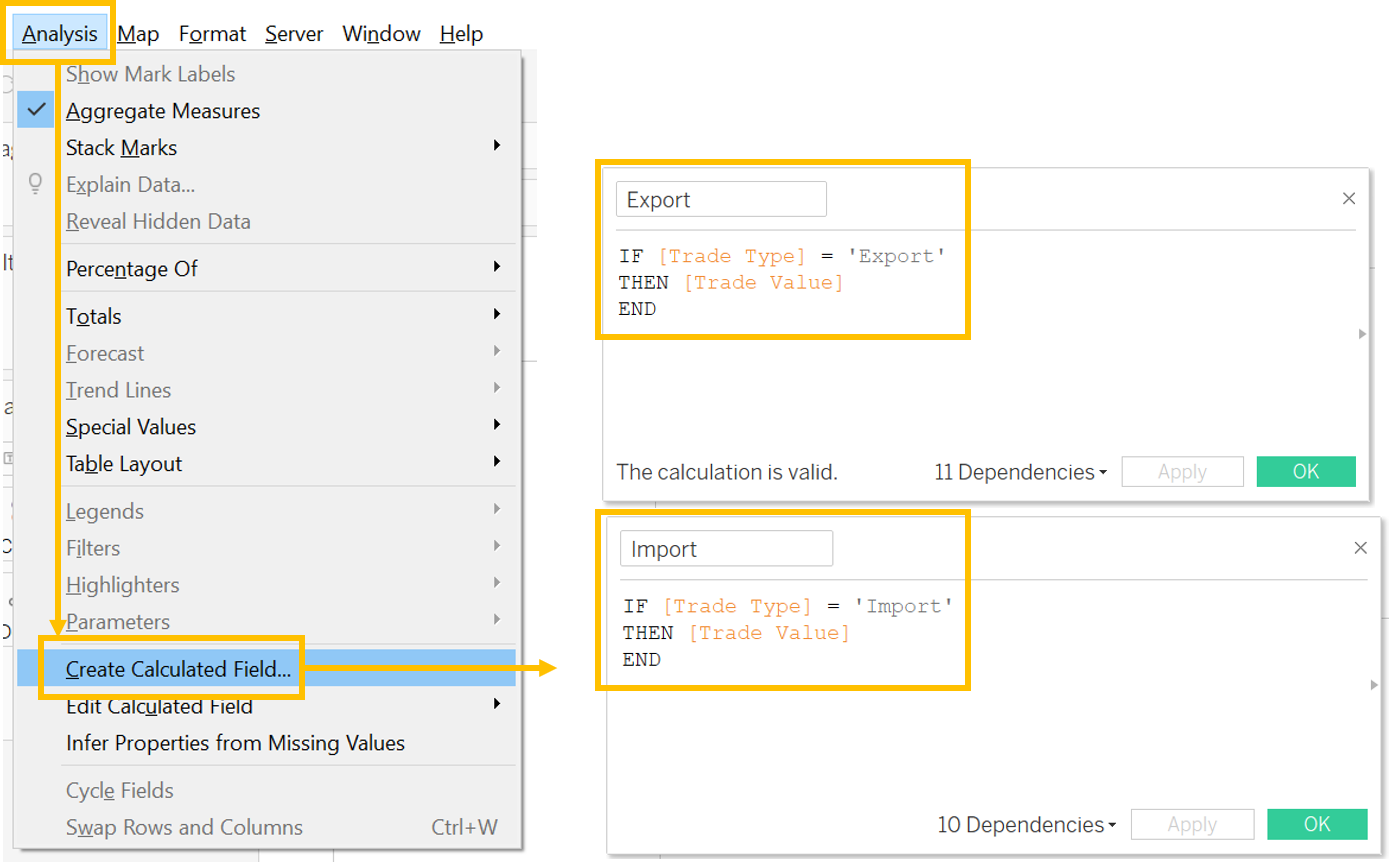 | 13 | For the bubble chart, create a new worksheet and name it ‘Bubble Chart’. Click on ‘Analysis’ on the ribbon, and select ‘Create Calculated Field’ to create 2 calculated fields – ‘Export’ and ‘Import’ using the ‘IF X THEN X END’ formulas shown. | ![]() |