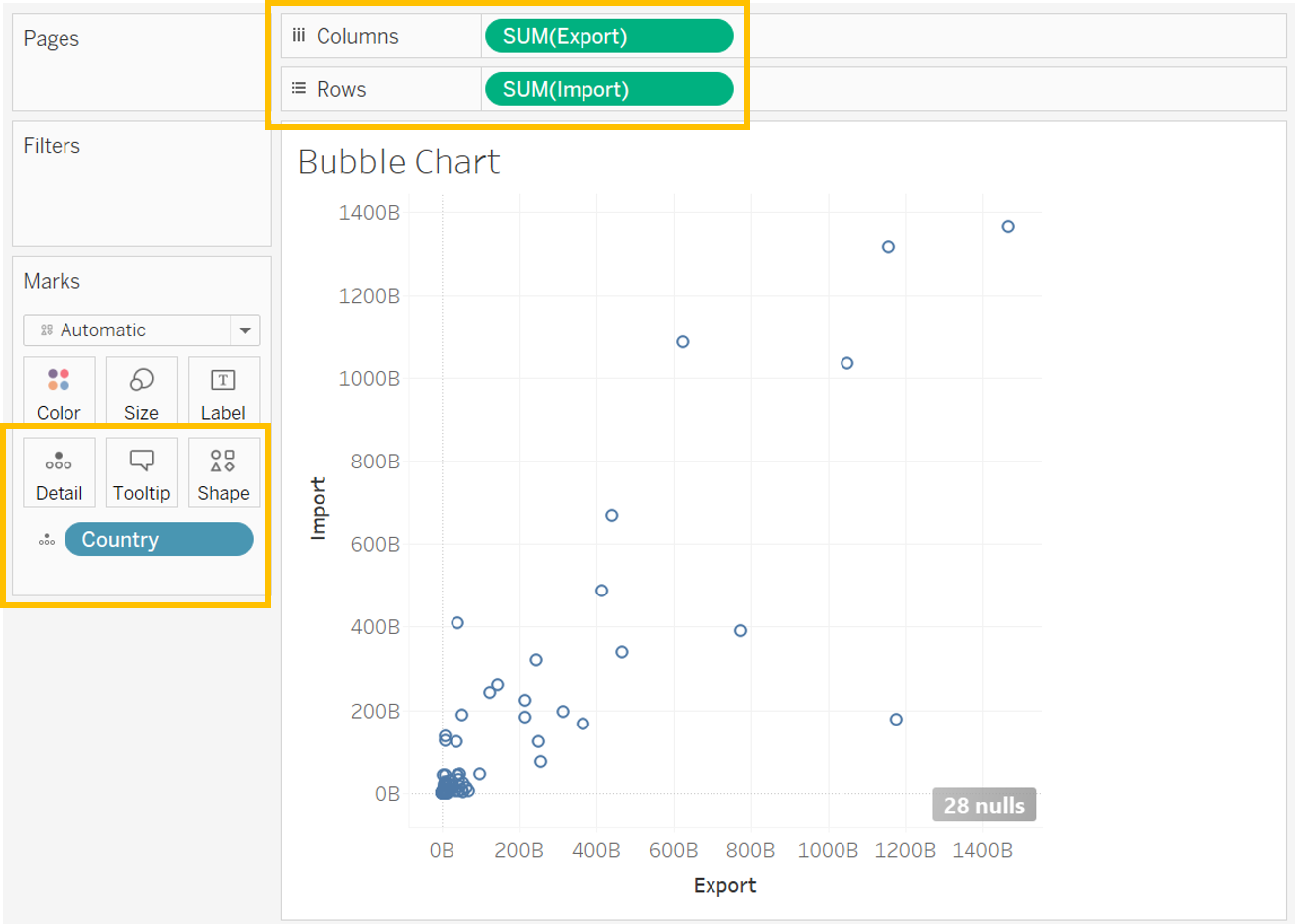 | 14 | Drag ‘Export’ to Columns and ‘Import’ to Rows and drag ‘Country’ to ‘Detail’ under Marks. Tableau will automatically present a scatter plot. | ![]() |