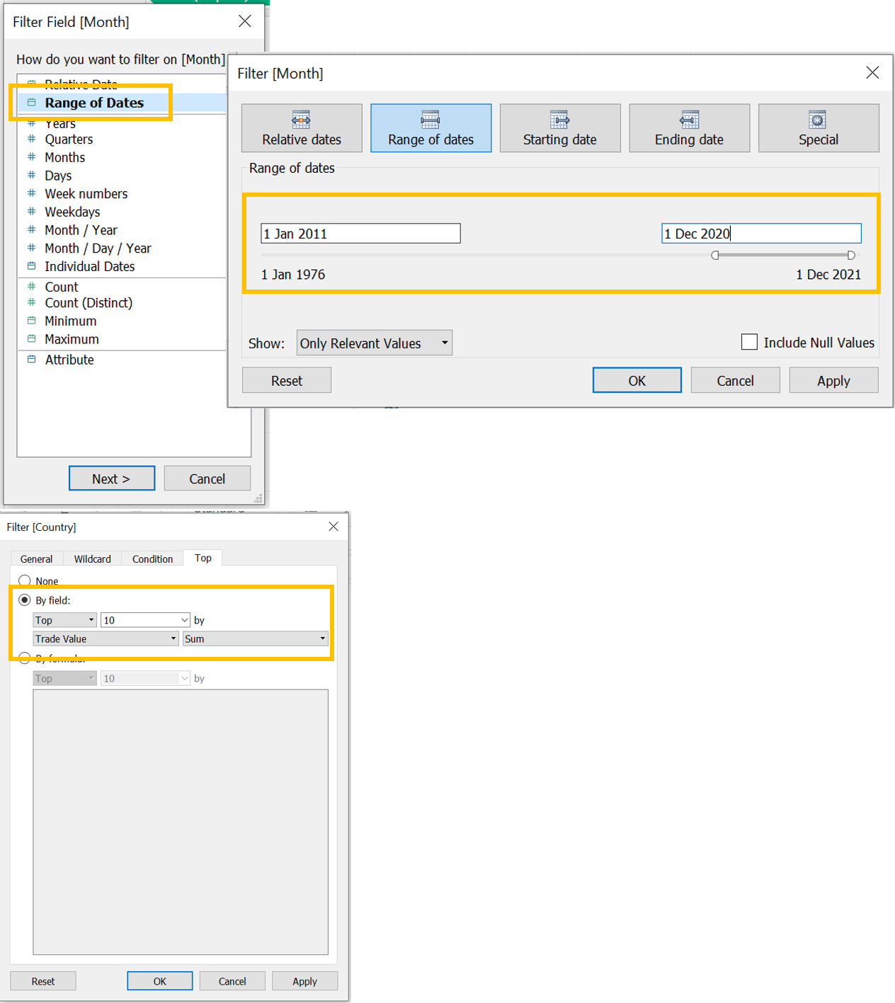 | 15 | Drag ‘Month’ to ‘Filters’ and select ‘Range of Dates’. Then input ‘1 Jan 2011’ as the start date and ‘1 Dec 2020’ as the end date. Next, drag ‘Country’ to ‘Filters’ and select ‘Top’ tab. We will select the top 10 partners by sum of the ‘Trade Value’. | ![]() |