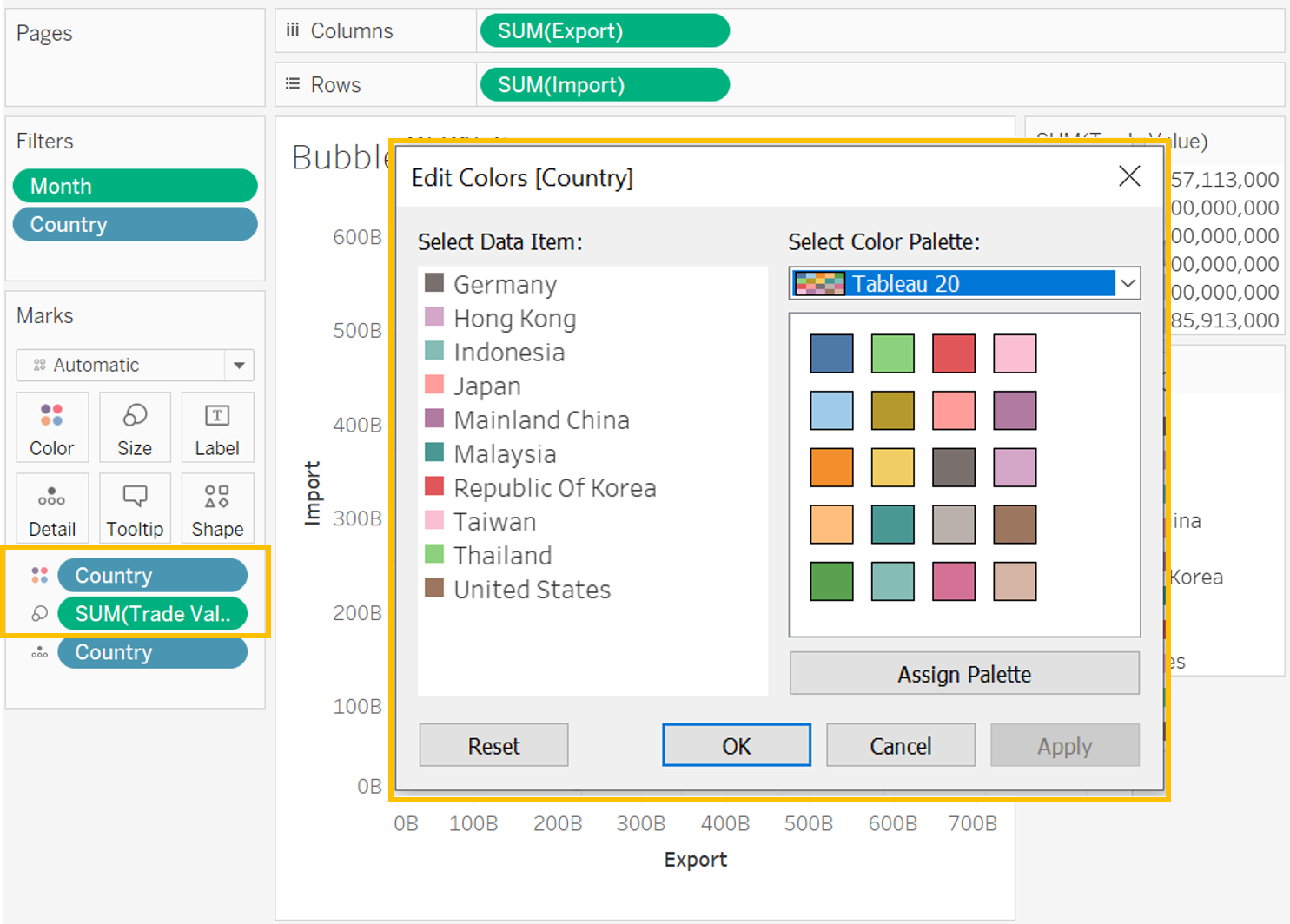 | 16 | Drag ‘Trade Value’ to ‘Size’ under Marks and ‘Country’ to ‘Color’. Select on ‘Color’ under marks to change the default colors. Under ‘Select Color Palette’, select Tableau 20. Assign the partners as planned, East Asia markets with pink and purple hues, South East Asia markets in greenish hues, and Germany in Grey and US in brown. | ![]() |