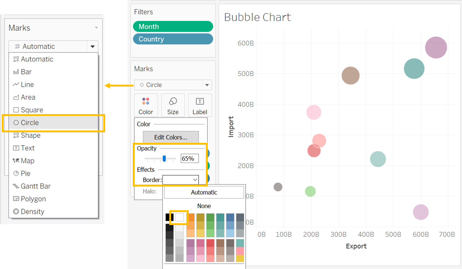 | 17 | Change the type of charts under ‘Marks’ to ‘Circle’. Then select ‘Color’ to change the opacity of the bubbles to 65% and add a white border under ‘Effects’. | ![]() |