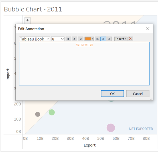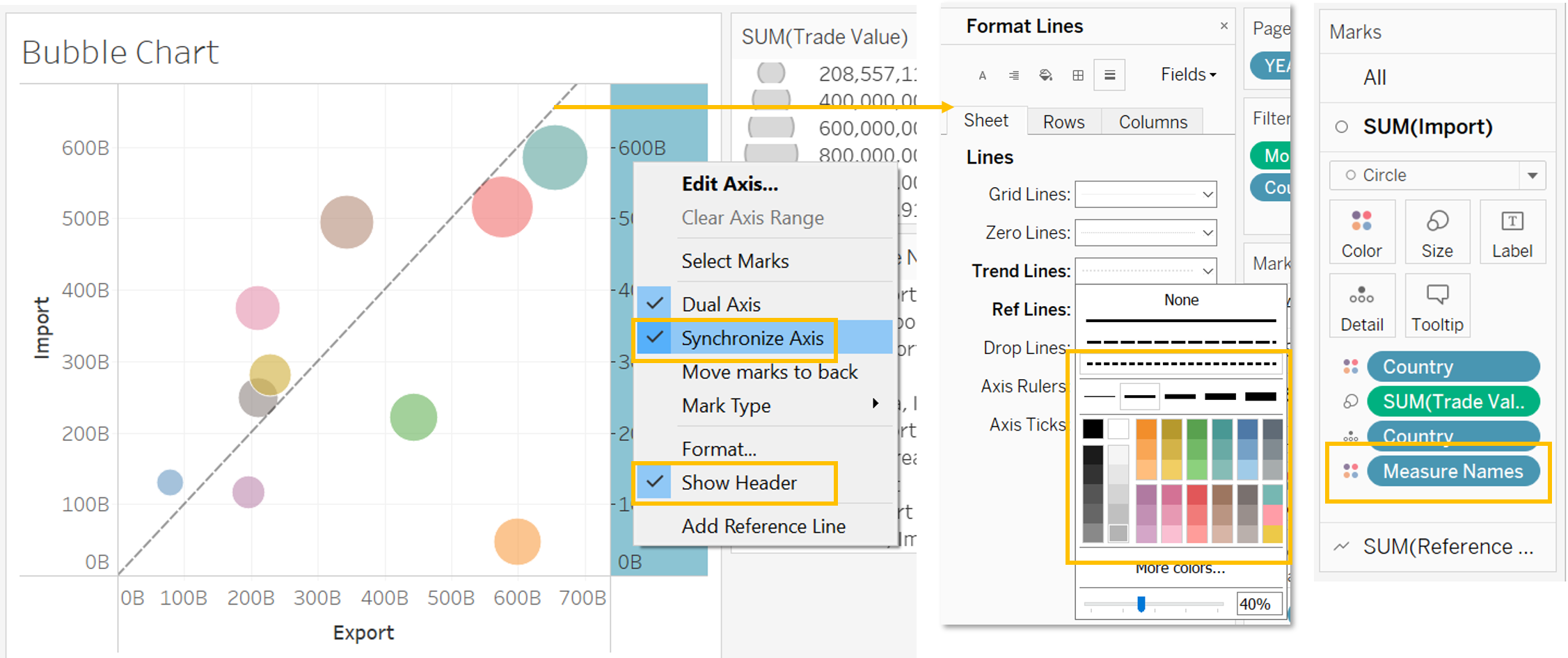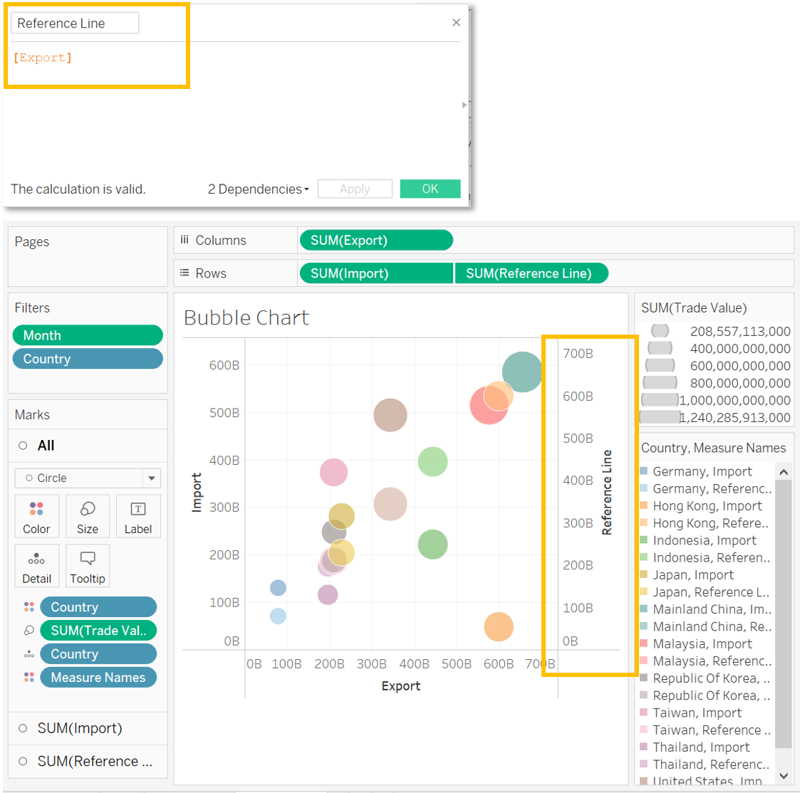 | 18 | To create a diagonal reference line in the bubble chart, create a new ‘Calculated Field’ called ‘Reference Line’ with ‘Export’ variable. Then drag the newly created ‘Reference Line’ to secondary Y-Axis position on the bubble chart as shown. | ![]() |