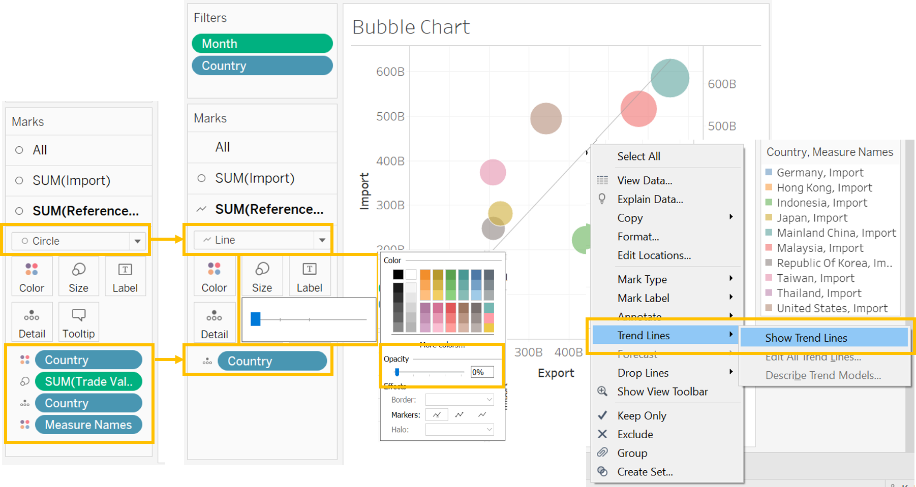 | 19 | Then click on the ‘SUM(Reference Line)’ section under ‘Marks’. Change the chart type from ‘Circle’ to ‘Line’ and only keep ‘Country’ under ‘Detail’. Next, change the ‘Size’ of the line to the thinnest and change the ‘Opacity’ to 0%. To bring out a nice reference line, right click on the reference line on the chart and select ‘Show Trend Lines’. | ![]() |