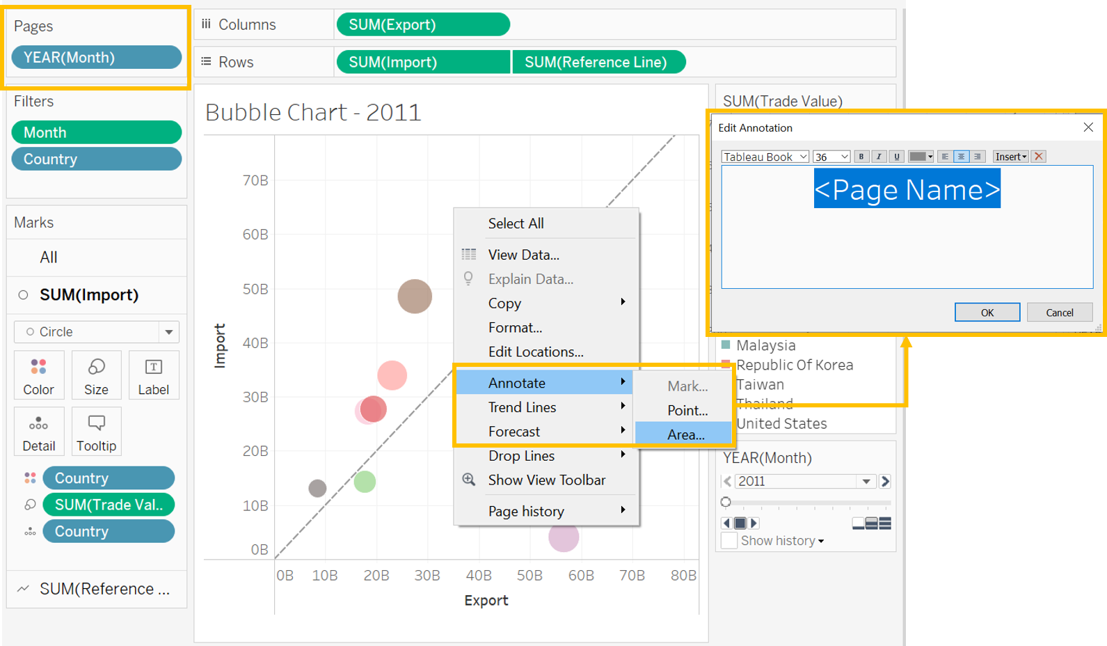 | 21 | Drag ‘Month’ into ‘Pages’. Right click on the chart to add the year to the chart by selecting ‘Area’ under ‘Annotate’. Insert ‘ |