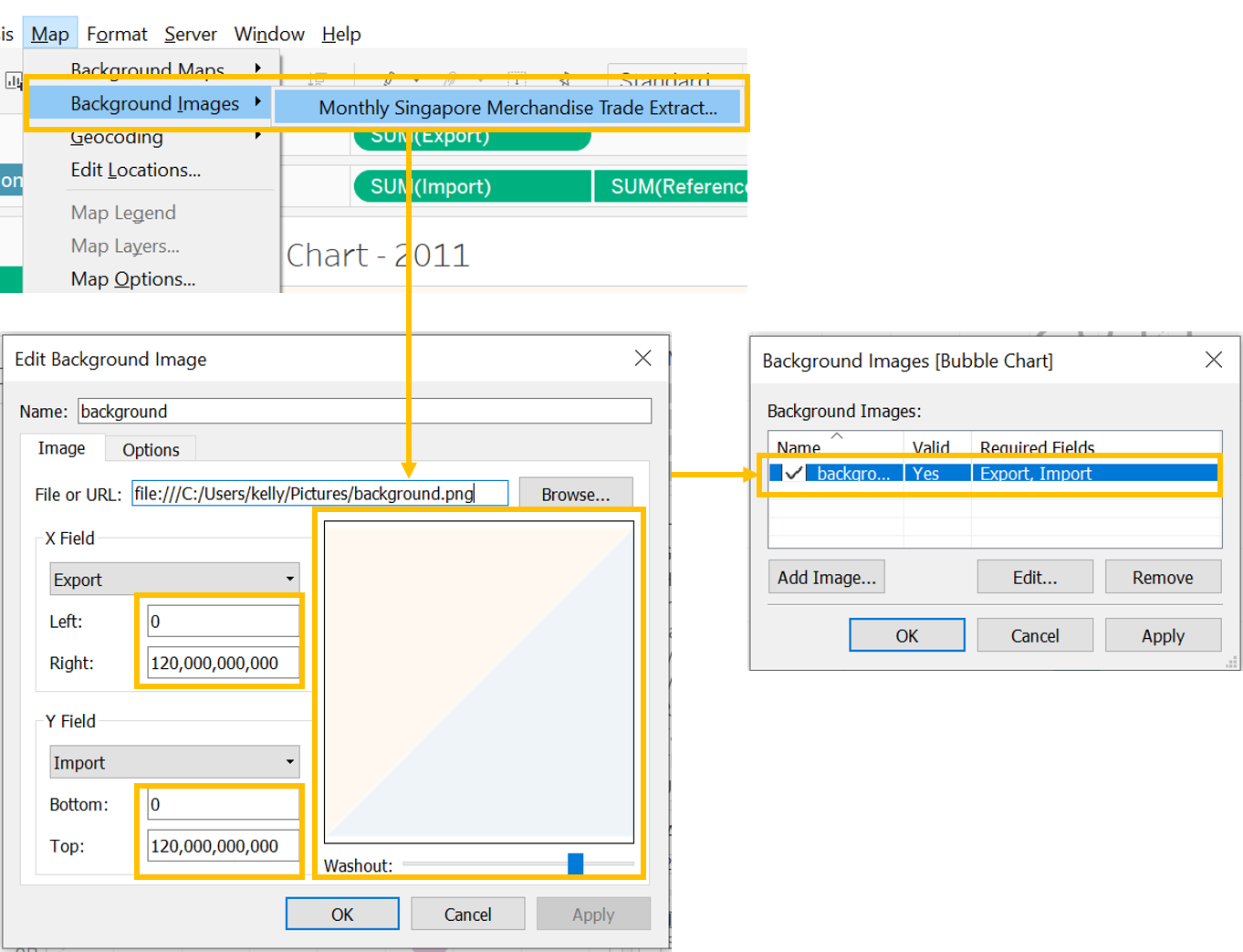 | 22 | To shade the background diagonally to create ‘Net Importer’ and ‘Net Exporter’ segments, we create a simple square image with 2 triangles using powerpoint. We then load this image into Tableau using ‘Map’ > ‘Background Images’. Select the image created and position it on the chart carefully using the coordinates. Tweak the washout to avoid overwhelming the chart with colours. | ![]() |
