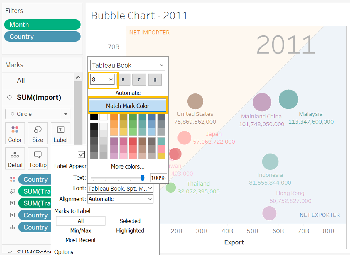 | 24 | Drag ‘Country’ and ‘Trade Value’ to ‘Label’ under ‘Marks’. Format the labels – reduce font size to 8 and select ‘Match Mark Color’. | ![]() |