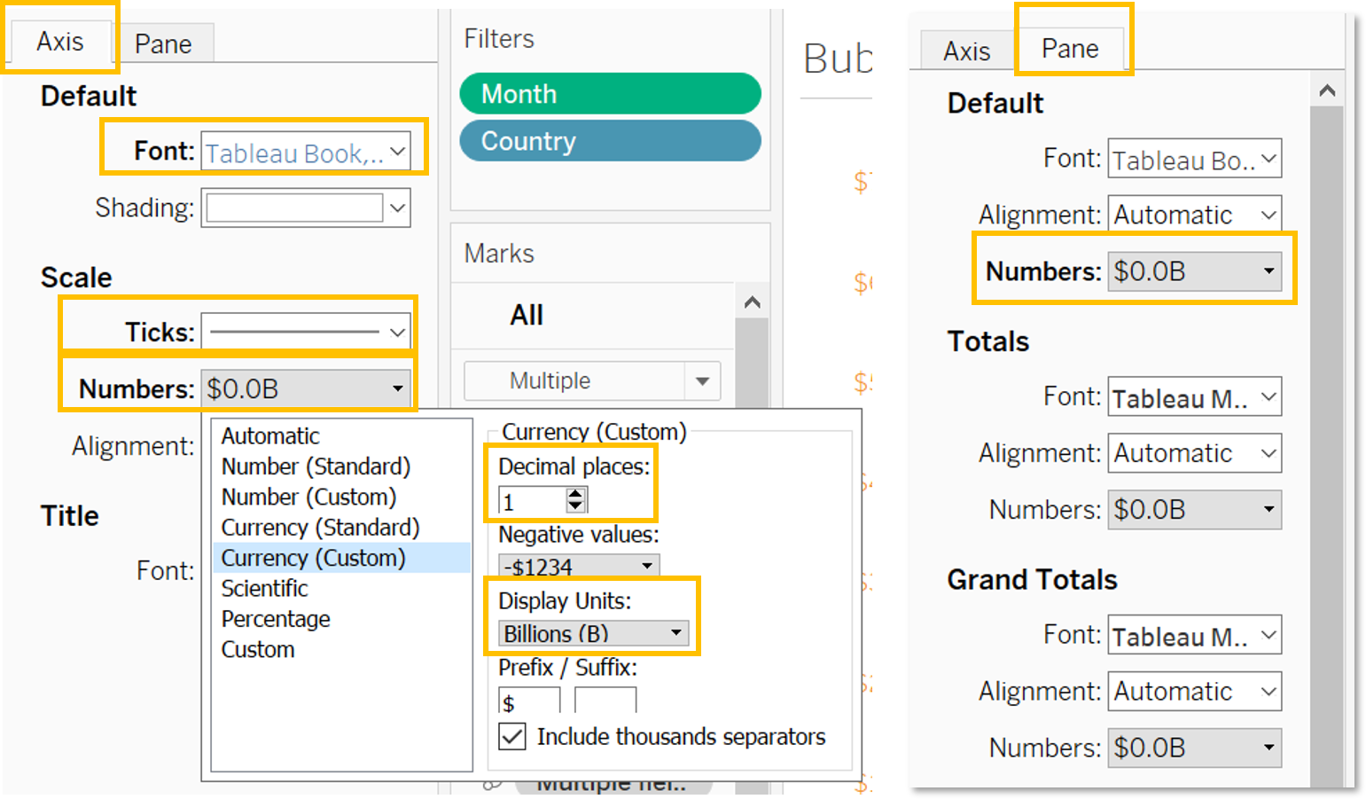 | 25 | Format all values on chart. Right click on the X-axis and select ‘Format’. A formatting pane will appear on the left. Under ‘Font’, change the font colour for X-Axis to blue. Under ‘Scale’, change the ‘Ticks’ to a darker grey and select ‘Currency (Custom)’ under ‘Numbers’ to format values to 1 decimal place in Billions. Repeat for Y-Axis (font colour in orange). Select ‘Label’ under ‘Marks’ to update the ‘Numbers’ format under ‘Pane’. | ![]() |