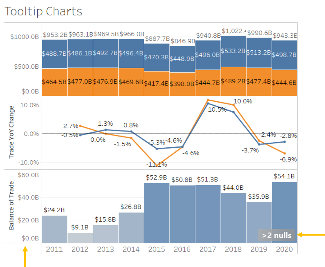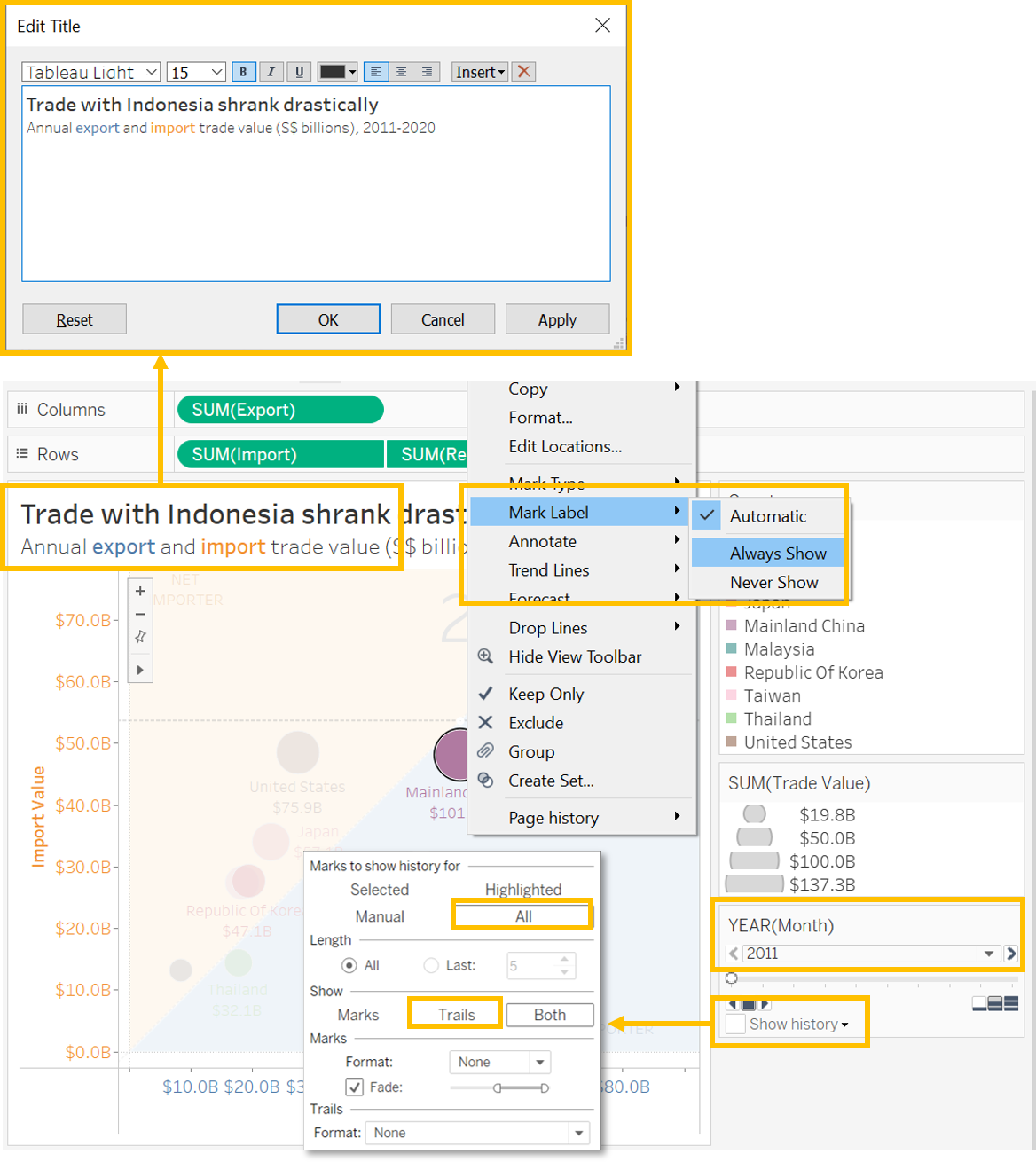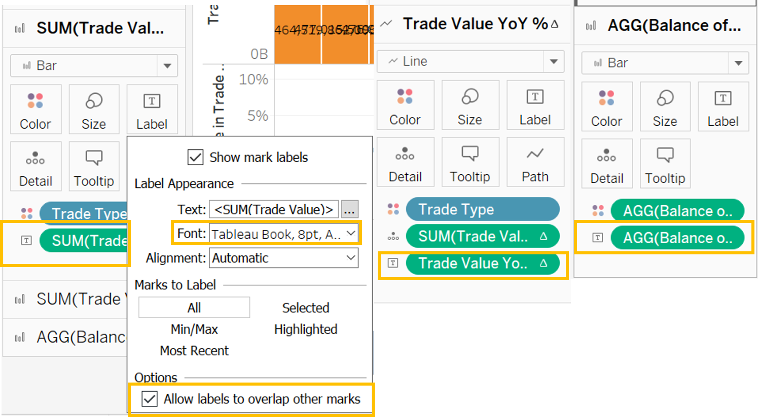 | 30 | Add values to the ‘Label’ section under each chart by dragging ‘Trade Value’ to ‘Label’ for chart i), ‘Trade Value YoY %’ to chart ii) and ‘Balance of Trade’ to chart iii). Next, format the labels to show them all at font size 8, allowing labels to overlap. Currency will be expressed in 1 decimal place in Billions and percentage in 1 decimal place using the same format procedure shown in step 25. | ![]() |