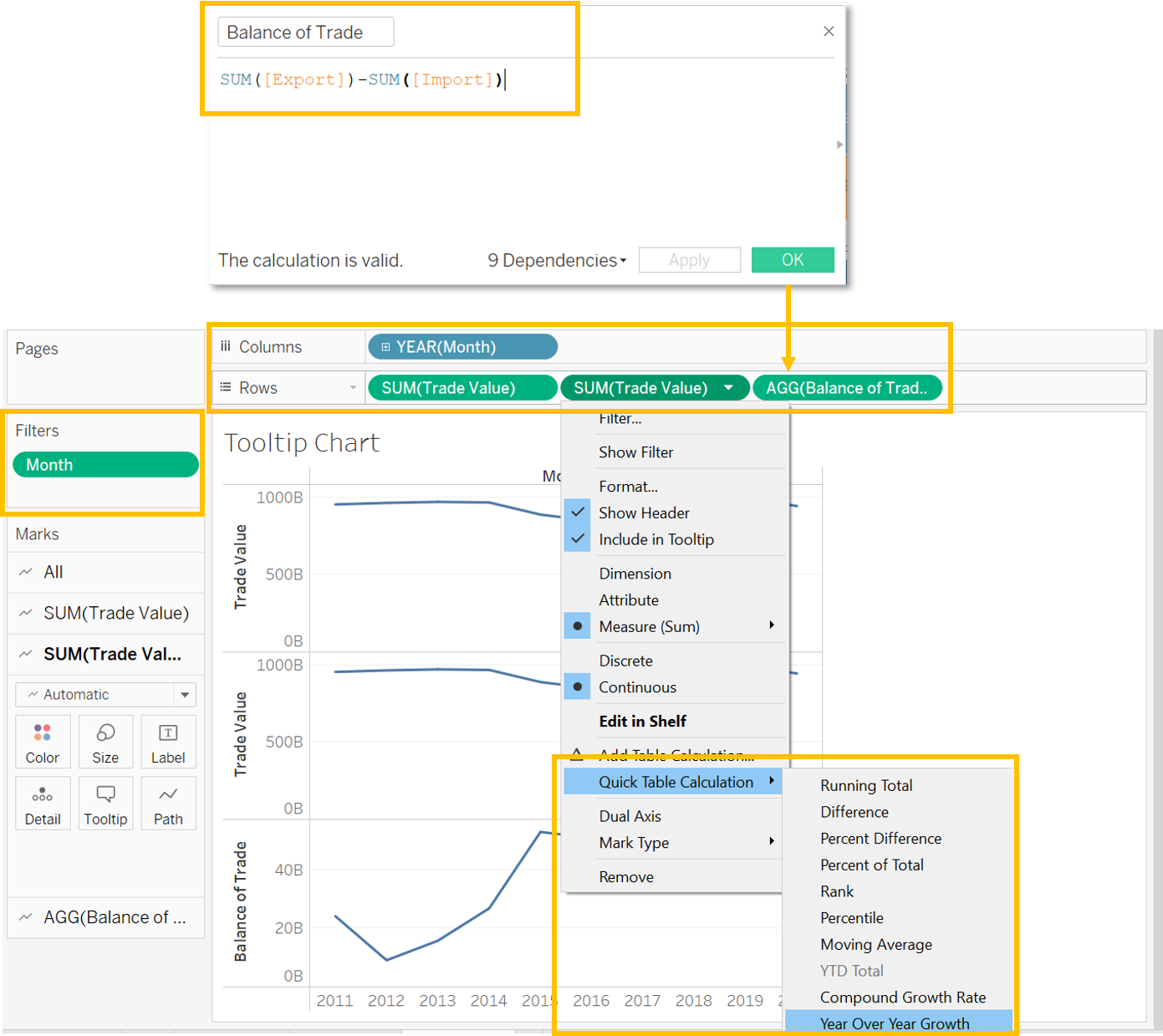 | 28 | Next, we prepare for charts that will provide more details of the partners under the tooltips when users explore the bubble charts. We create a new worksheet called ‘Tooltip Charts’. We want to feature 3 charts: i) annual trade value, ii) year-on-year change of annual trade value, iii) annual balance of trade. For chart iii), we create a new calculated field ‘Balance of Trade’ by taking sum of export minus sum of import as shown. Then, we add ‘Month’ to ‘Filters’ and select range like in Step 15. To set up the 3 charts, we drag ‘Month’ to ‘Columns’, ‘Trade Value’ and ‘Balance of Trade’ to ‘Rows’. Drag ‘Trade Value’ to ‘Rows’ again and select the drop down to do a quick table calculation – ‘Year Over Year Growth’. | ![]() |