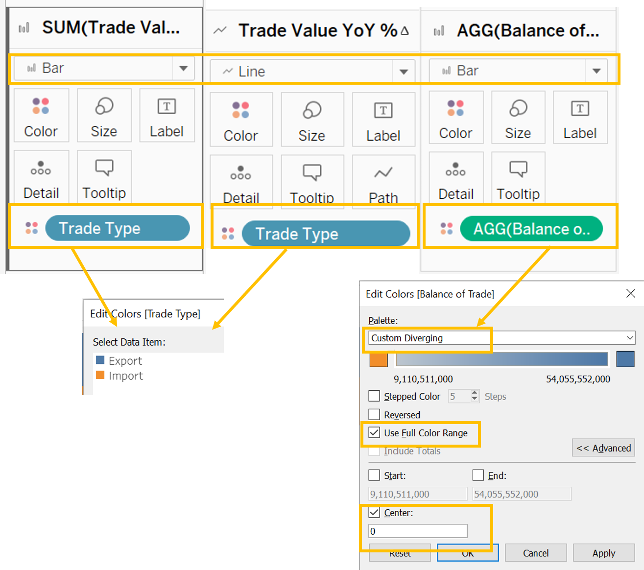 | 29 | Change the chart type under ‘Marks’ to ‘Bar’ and ‘Line’ respectively as shown. For chart i) on total trade value, drag ‘Trade Type’ to ‘Color’. Export will be in blue and import will be in orange, similar for chart ii). For chart iii), drag ‘Balance of Trade’ to ‘Color’ and select ‘Custom Diverging’ with the center at 0, the negative end will be the orange selected for import and positive end will be the blue selected for export. | ![]() |
