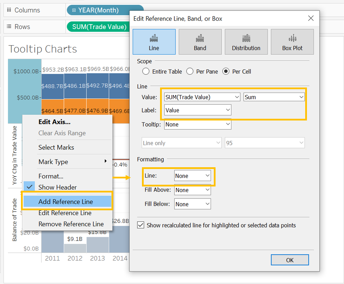 | 31 | Add the total trade value label by adding a reference line to chart i)’s Y-Axis. Select ‘Sum’ and indicate ‘Value’ under ‘Label’. Under ‘Formatting’, select ‘None’ for ‘Line’. | ![]() |