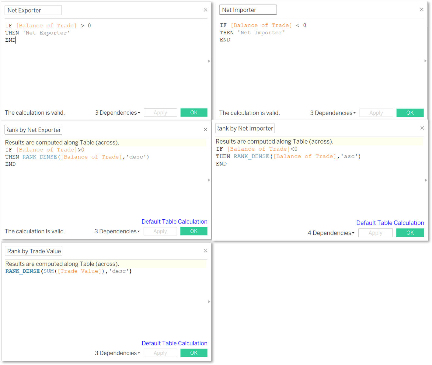 | 33 | As we want to indicate if the partner is a net exporter or net importer at the snapshot, we created new calculated fields ‘Net Exporter’ and ‘Net Importer’. Next, we also want to feature the rank of the partner by ‘Trade Value’, ‘Net Exporter’ and ‘Net Importer’, we created calculated fields to rank the partners as shown. | ![]() |