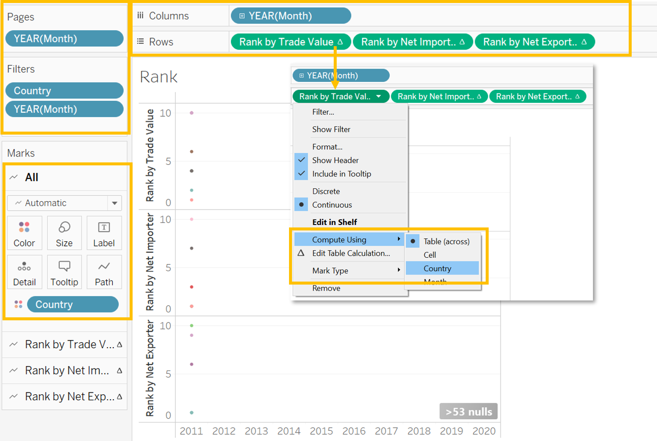 | 35 | To start on the second chart on the dashboard to display rank, we create a new worksheet ‘Rank’. We then drag ‘Country’ and ‘Month’ to ‘Filters’ (similar to step 15) and ‘Month’ to ‘Pages’ to limit the country and years. We create the chart by dragging ‘Month’ to ‘Columns’ and ‘Rank by Trade Value’, ‘Rank by Net Importer’ and ‘Rank by Net Exporter’ to ‘Rows’. To have the ranking computed at country level, we drag ‘Country’ to ‘Color’ under ‘All’ section under ‘Marks’. Then, we can compute the rank using ‘Country’ ausing the dropdown option. | ![]() |