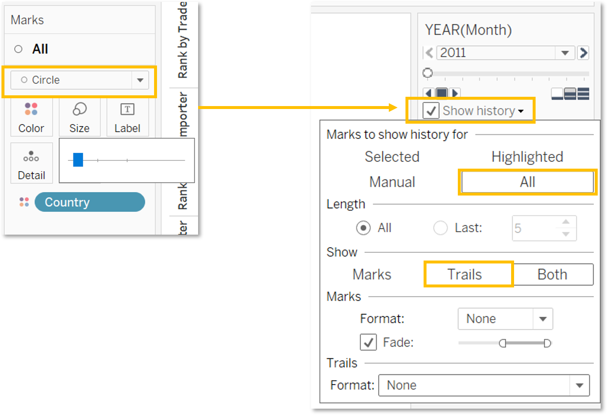 | 36 | To sync the animation with the bubble chart, we switch the chart type under ‘Marks’ to ‘Circle’ and reduce the size of the circle. Next, we will check the ‘Show history’ box for the control for ‘Pages’ on the right pane. To show the trails of the ranks, we will show history for ‘All’ and show ‘Trails’ marks only. | ![]() |