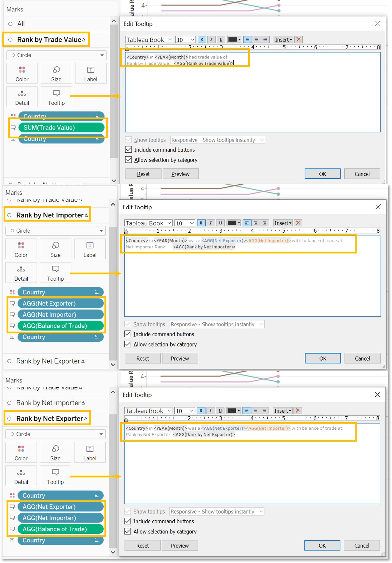 | 34 | Next, we will set up the tooltip content. Drag ‘Net Exporter’, ‘Net Importer’, ‘Rank by Trade Value’, ‘Rank by Net Exporter’ and ‘Rank by Net Importer’ all to ‘Tooltip’ under the ‘SUM(Import)’ section under ‘Marks’. Click on the ‘Tooltip’ icon to launch the editor and input the text interspersed with inserted variables as shown. Insert the ‘Tooltip Charts’ worksheet at the end of the text. Format the text by colouring all import related to be orange and export related to be blue. | ![]() |