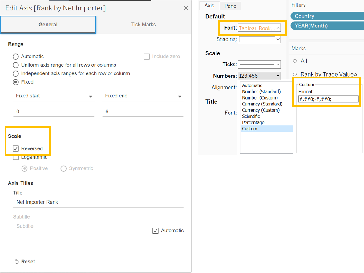 | 38 | We will also need to refine the Y-Axes so that we show the ranking from top to bottom. To do that, we will edit all 3 axes so that the scales are reversed. To prevent the 0 from showing, we will format the scales using ‘Custom’ and adding a semi-colon and a space (‘;’) behind the custom number format. For the net exporter and net importer scale, we will also colour the fonts with blue and orange respectively to sync with the bubble chart. | ![]() |