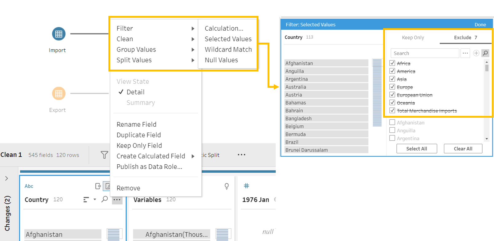 | 4 | Under ‘Clean 1’ node, filter the rows under ‘Country’ to remove non-Country and total observations. Repeat for ‘Clean 2’. | ![]() |