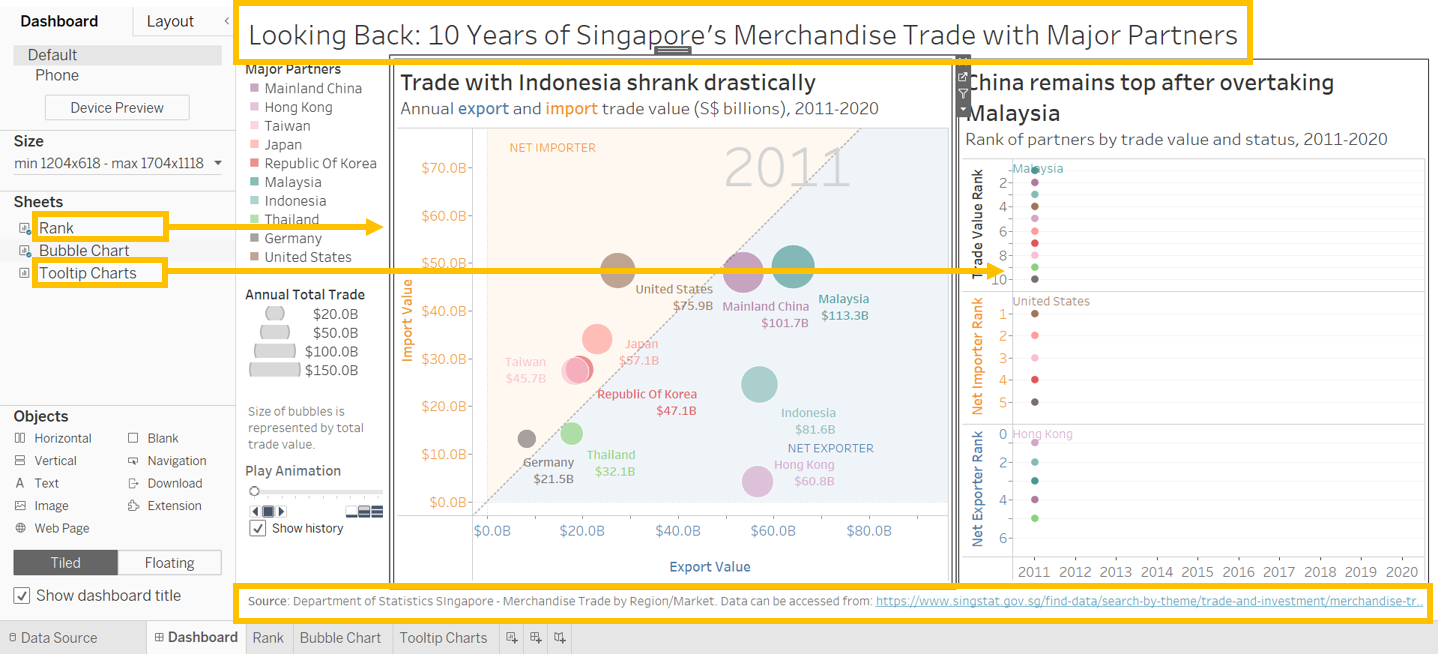 The original visualisation (Figure 1) is created by Department of Statistics, Singapore (DOS) as an interactive infographic to showcase Singapore’s International Trade. The data are available under the sub-section of Merchandise Trade by Region/Market.