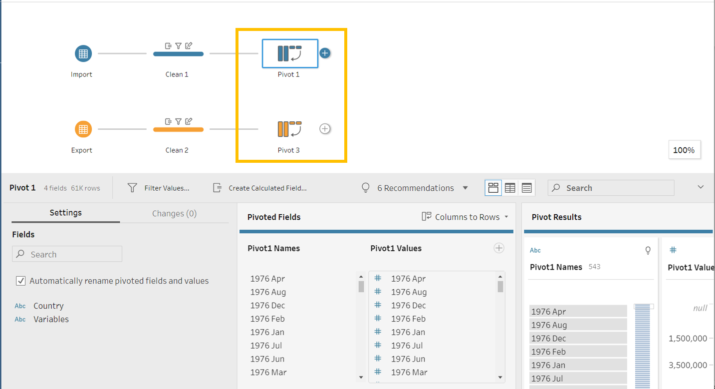 | 5 | Add Pivot nodes after ‘Clean 1’ and ‘Clean 2’. Under ‘Pivot 1’, select all months under ‘Fields’ to the ‘Pivoted Fields’ panel. Repeat for ‘Pivot 2’. | ![]() |
