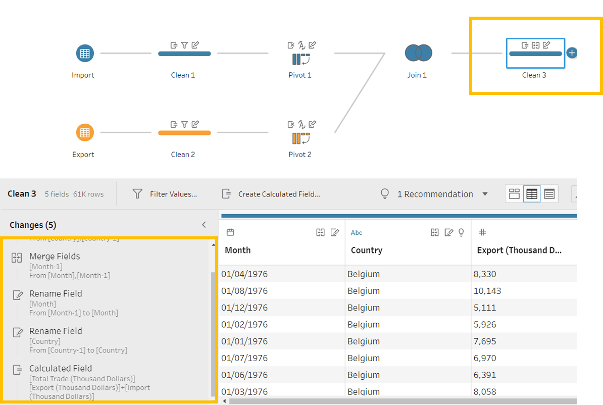 | 10 | Split ‘Pivot1 Names’ and rename the field of ‘Split 1’ to ‘Trade Type’. Multiply ‘(Thousand Dollars)’ by 1000 and rename it ‘Trade Value’. Remove the unnecessary fields ‘(Thousand Dollars)’ and ‘Pivot1 Names’. | ![]() |