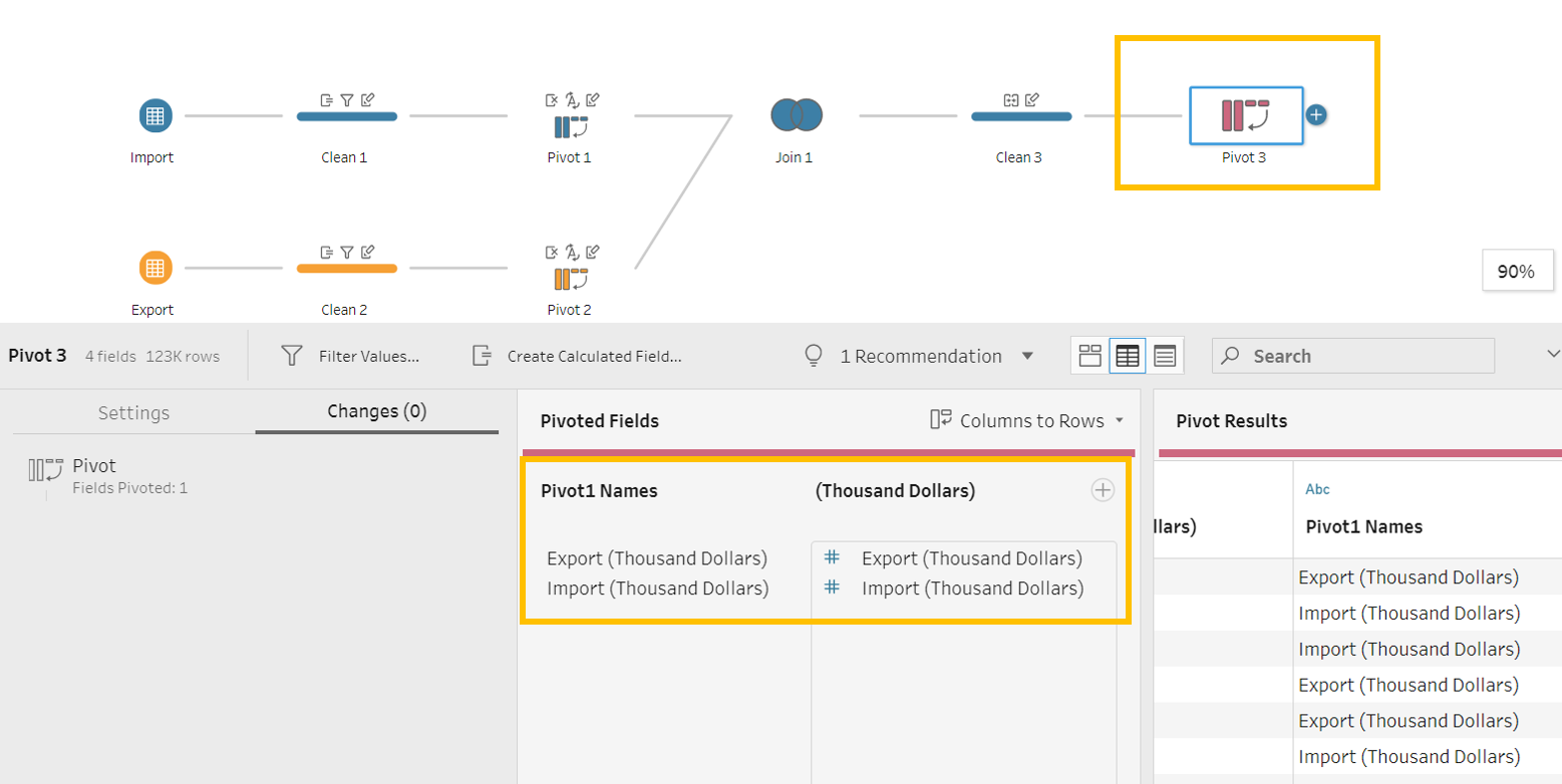 | 9 | Create a ‘Pivot’ node after ‘Clean 3’ and change ‘Export (Thousand Dollars)’ and ‘Import (Thousand Dollars)’ from columns to rows. | ![]() |